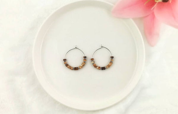 Laissez-moi vous présenter TALULAH, Créoles acier et perles Heishi en pierres de JASPE PAYSAGE et OEIL DE TIGRE.