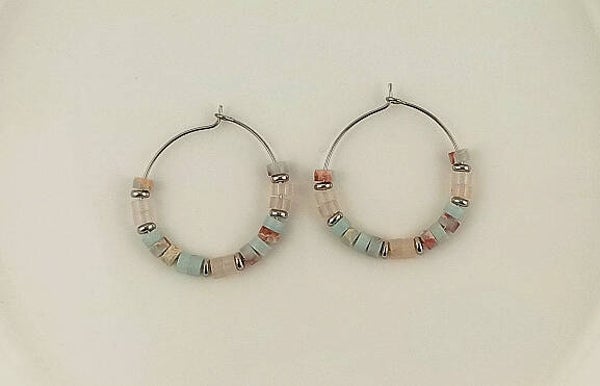 Laissez-moi vous présenter NOKOMIS, Créoles acier et perles Heishi en pierres de JASPE SHOUSHAN & AVENTURINE ROSE.