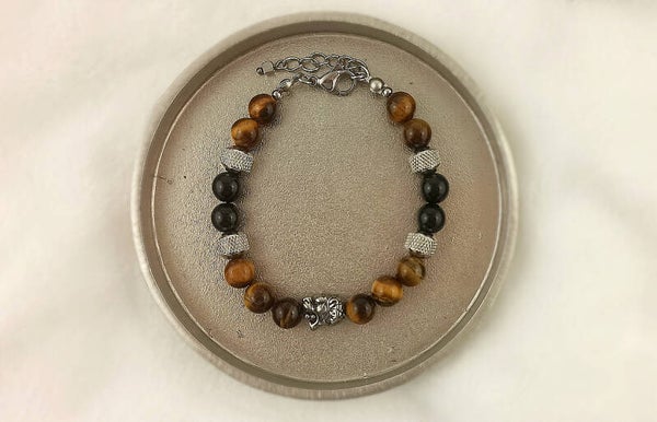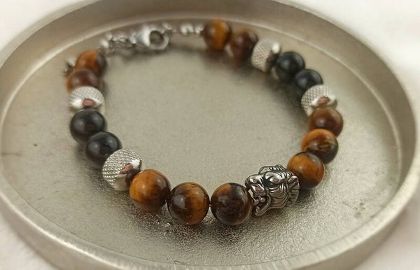 Laissez-moi vous presenter ISAO, Bracelet en OEIL DE TIGRE & ONYX avec sa tête de tigre en acier.